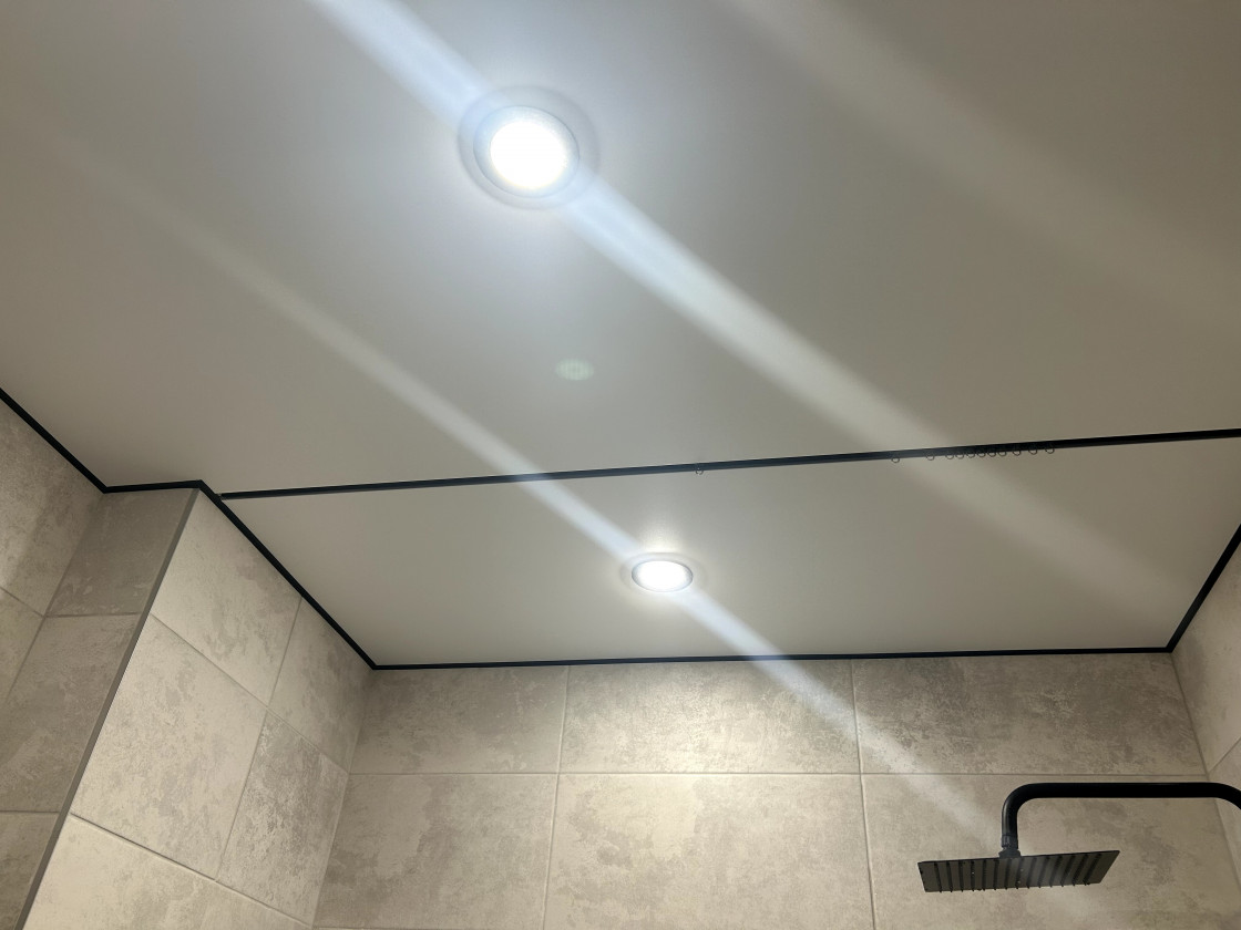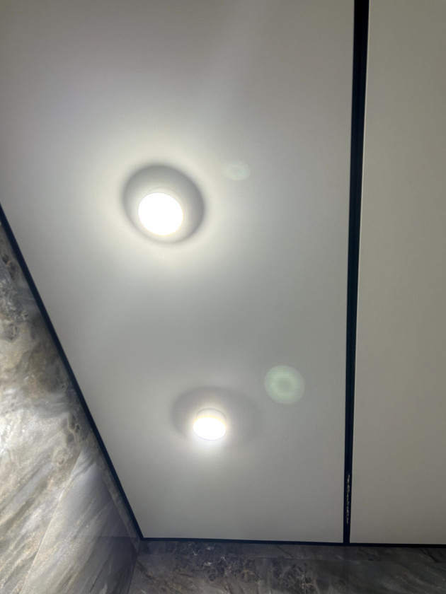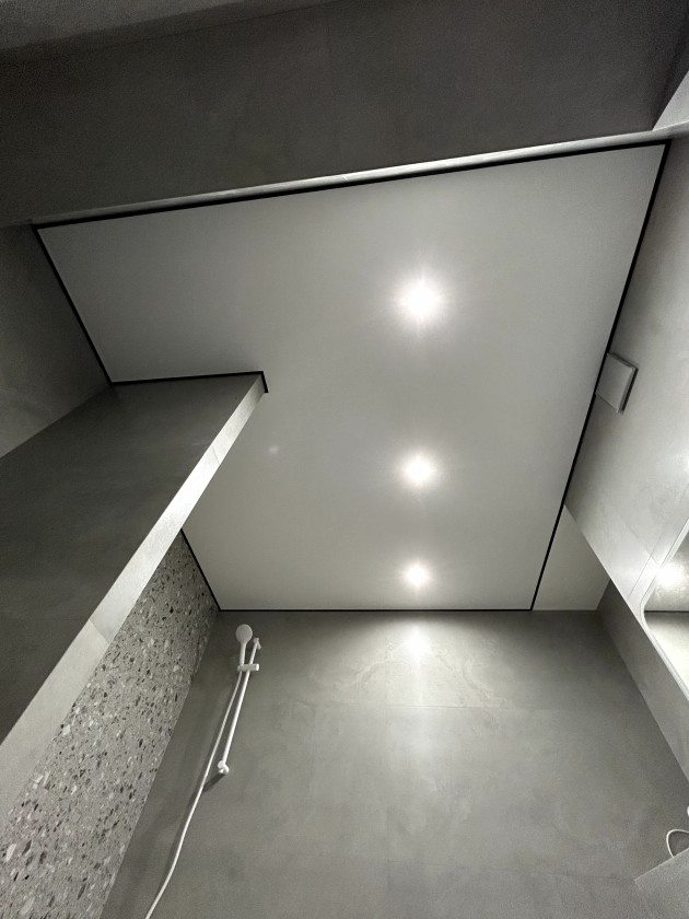 Натяжні стелі у ванних кімнатахвеликих розмірів встановлюють багаторівневі, щоб виділити зони. Зону купання та зону біля дзеркала. У такі конструкції вбудовується світлові прилади різного призначення. Так для зони купання світло може бути більш приглушеним, а зона біля дзеркала повинна освітлюватися краще. Також ефектніше виділить малюнок на тканині допомагає контраст полотен. Це полотно виглядає як мерехтлива піщана буря.